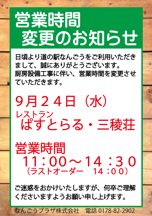 【9/24(水)】 工事に伴いレストランの営業時間変更